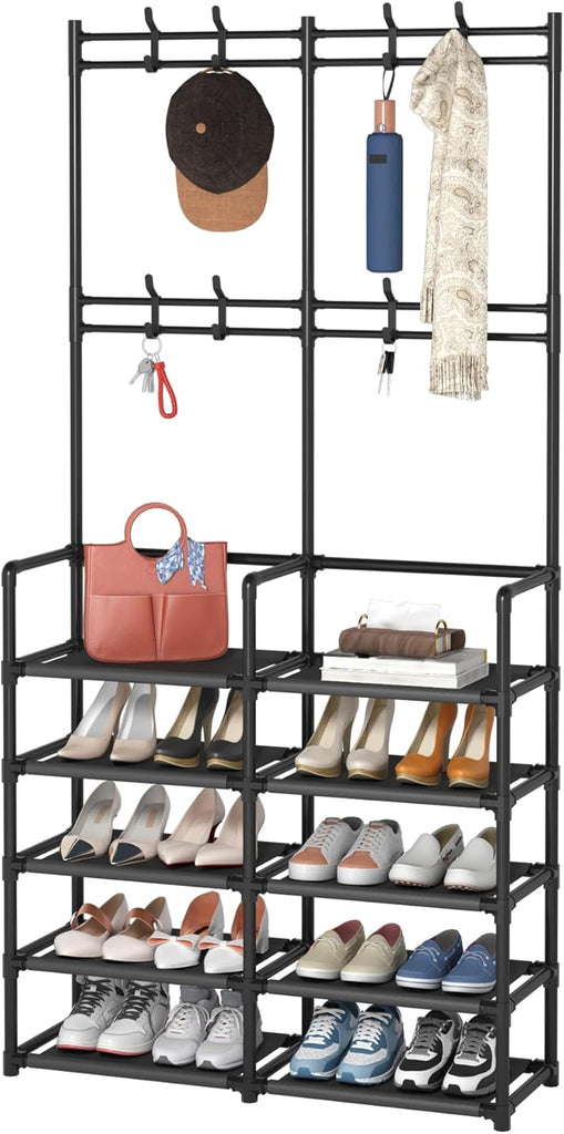 - [Multi-function]-8 hooks at the top for storing backpack, umbrellas, keys, scarf, etc. The bottom 10 shelves are used to store your shoes, up to 20 pairs of shoes.
