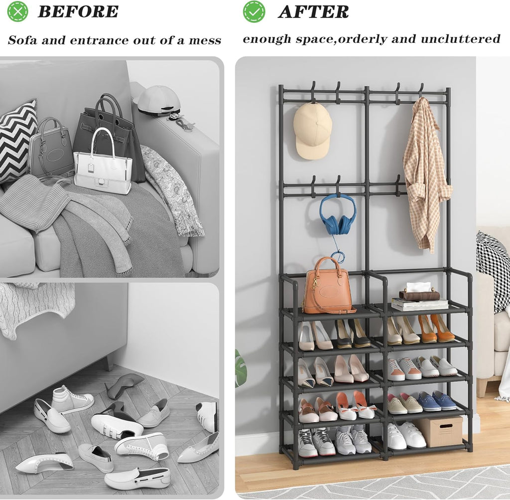 - [2-in-1 Design]-Perfect combination of coat rack and shoe rack. It helped clear up your entry way of shoes and gave you a place to hang your stuff. Suitable for your entryway, hallway, mudroom, living room or office.